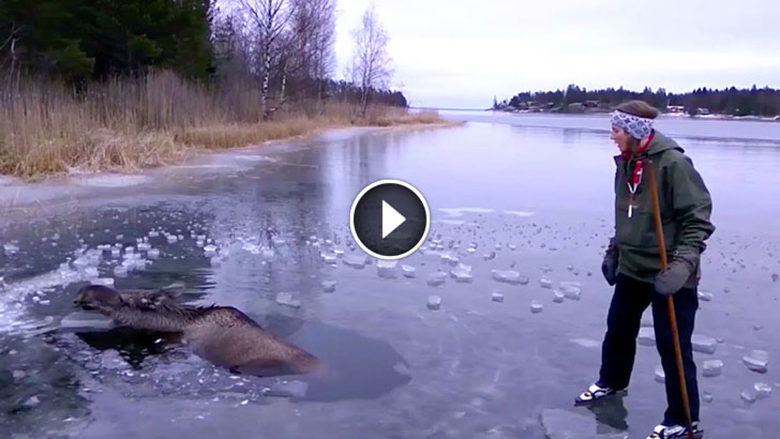 Nature is no joke, you make one mistake and you can end up dead. In normal circumstances falling through the ice into the freezing water would be the end of the road for this moose, but fortunately something incredible happened.